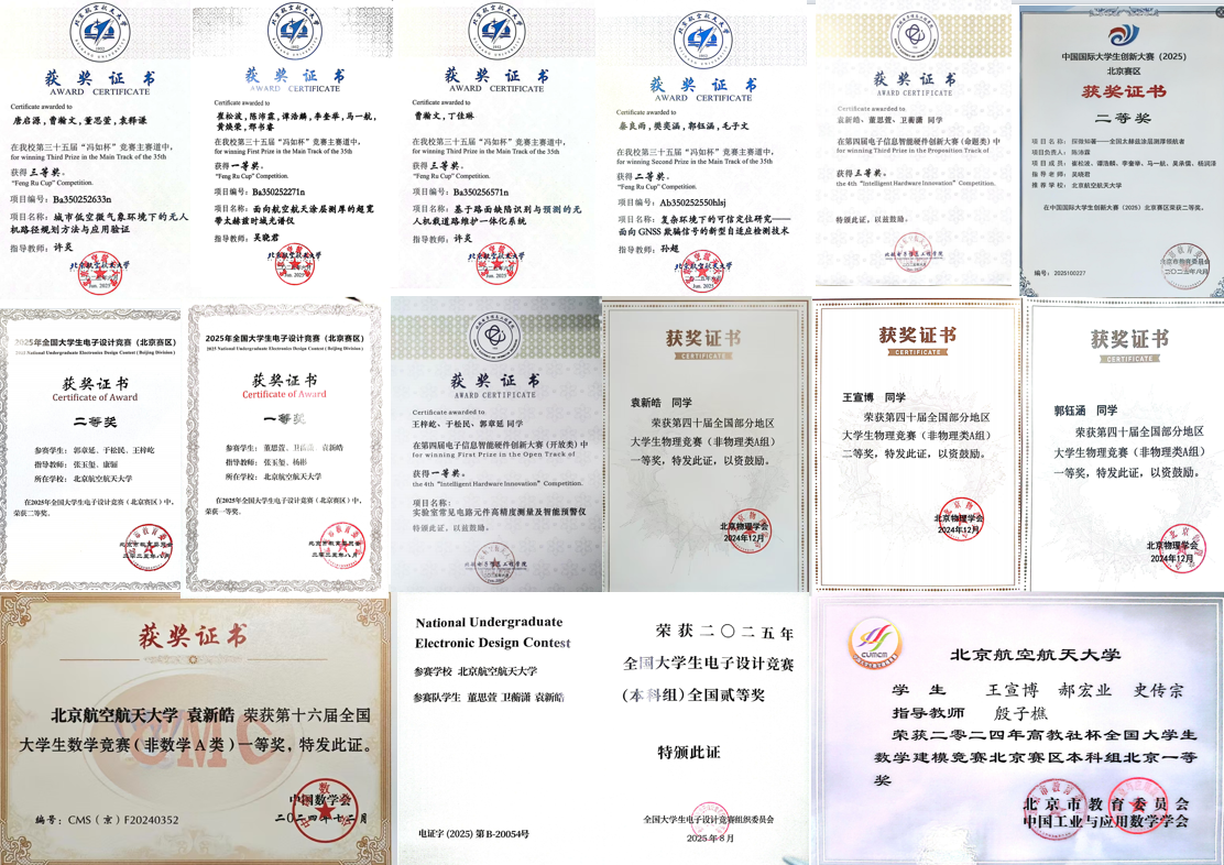 全员与科研导师实现双选匹配,参与实验室课题项目,共获得冯如杯主赛道奖项6项。有7人参与到省部级以上创新创业比赛中,获得揭榜挂帅专项赛擂主2项。在各类学科竞赛中共获国家级奖项10项,省部级38项。