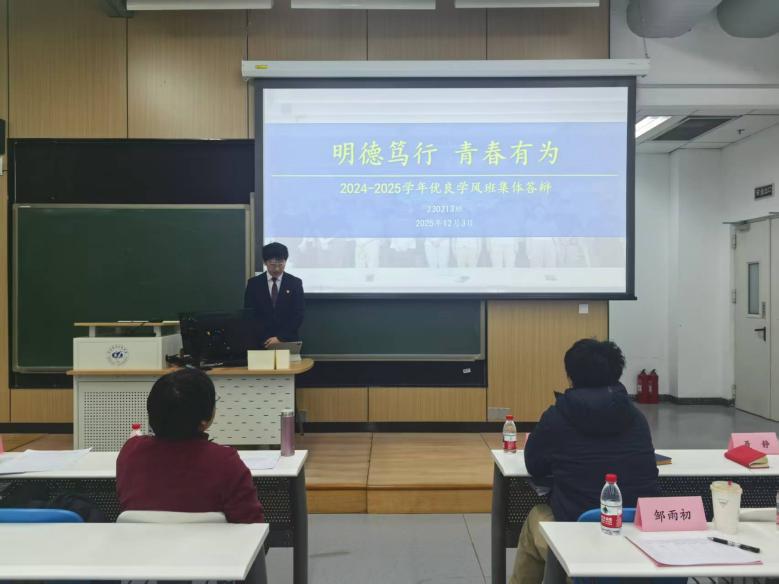 2025年12月3日,学院组织了优良学风班评审暨班主任联席会,由学院党委副书记姜宇,班主任代表孙超、李丽,专职辅导员聂静、郭佳伟,兼职辅导员邹雨初、苏雨晨组成的评审小组参加答辩。23级本科各班级进行5分钟的现场答辩,从学业成绩、学风建设、科创成果、小班活动等方面进行阐述。答辩后,评委进行提问,并和各小班交流班级建设活动、学业支持活动的开展情况。