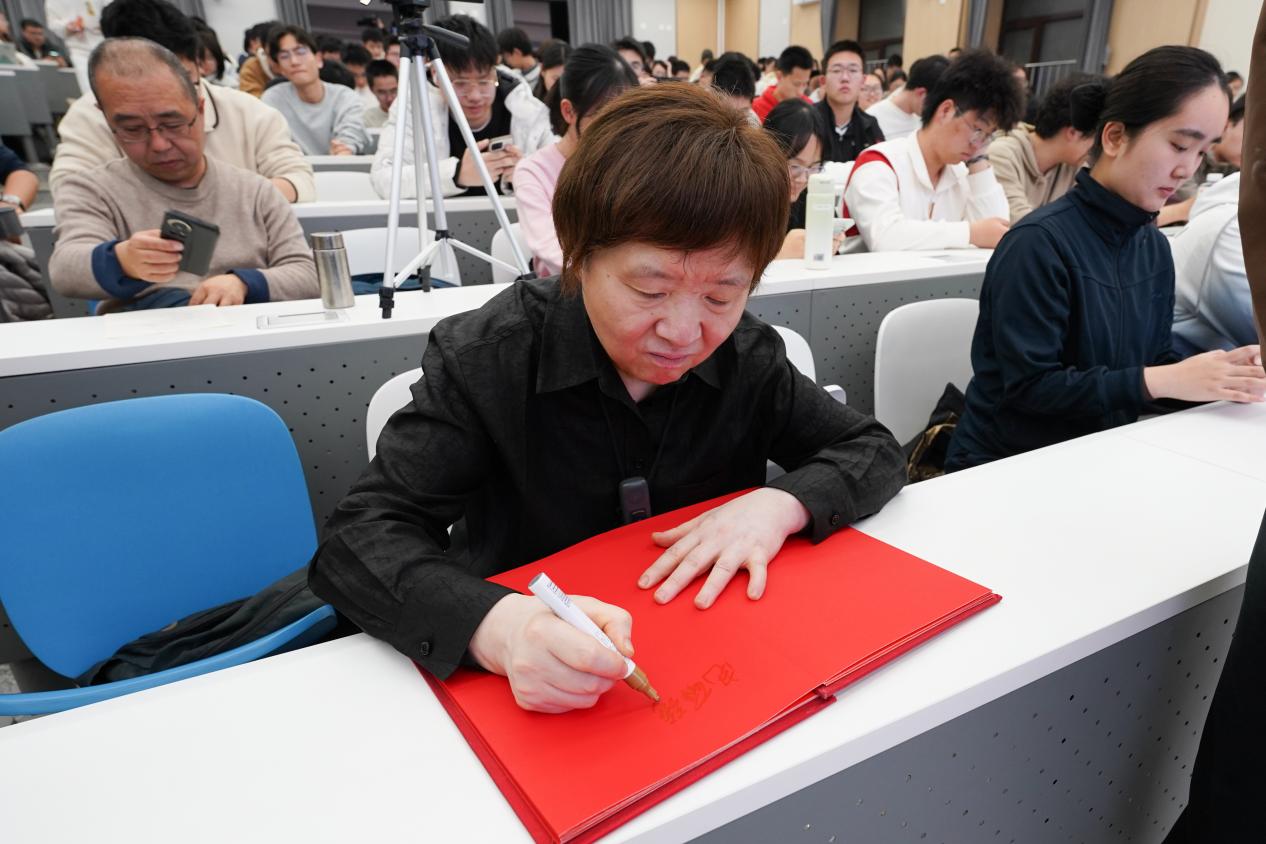 课程结束后,240291班同学为苏教授献上鲜花,感谢她的精彩讲授,并邀请苏教授题词留念。苏教授欣然提笔,写下“电磁强国,我辈担当”,并与同学们合影定格这难忘的瞬间。